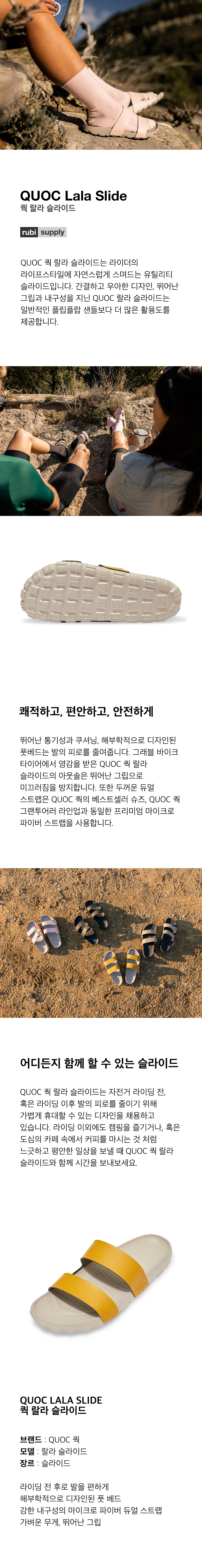 QUOC 쿽 랄라 슬라이드는 라이더의 라이프스타일에 자연스럽게 스며드는 유틸리티 슬라이드입니다. 간결하고 우아한 디자인, 뛰어난 그립과 내구성을 지닌 QUOC 랄라 슬라이드는 일반적인 플립플랍 샌들보다 더 많은 활용도를 제공합니다.