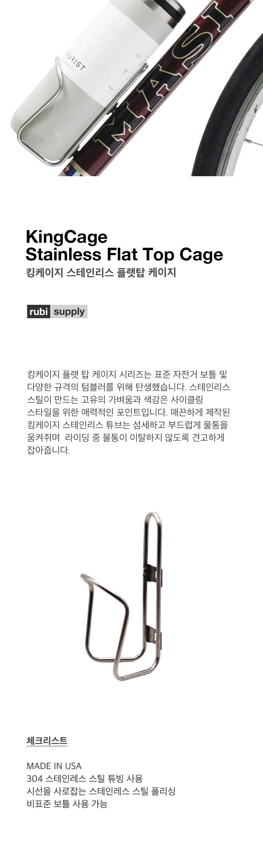 킹케이지 플랫 탑 케이지 시리즈는 표준 자전거 보틀 및 다양한 규격의 텀블러를 위해 탄생했습니다. 스테인리스 스틸이 만드는 고유의 가벼움과 색감은 사이클링 스타일을 위한 매력적인 포인트입니다. 매끈하게 제작된 킹케이지 스테인리스 튜브는 섬세하게 부드럽게 물통을 움켜쥐며 라이딩 중 물통이 이탈하지 않도록 견고하게 잡아줍니다.