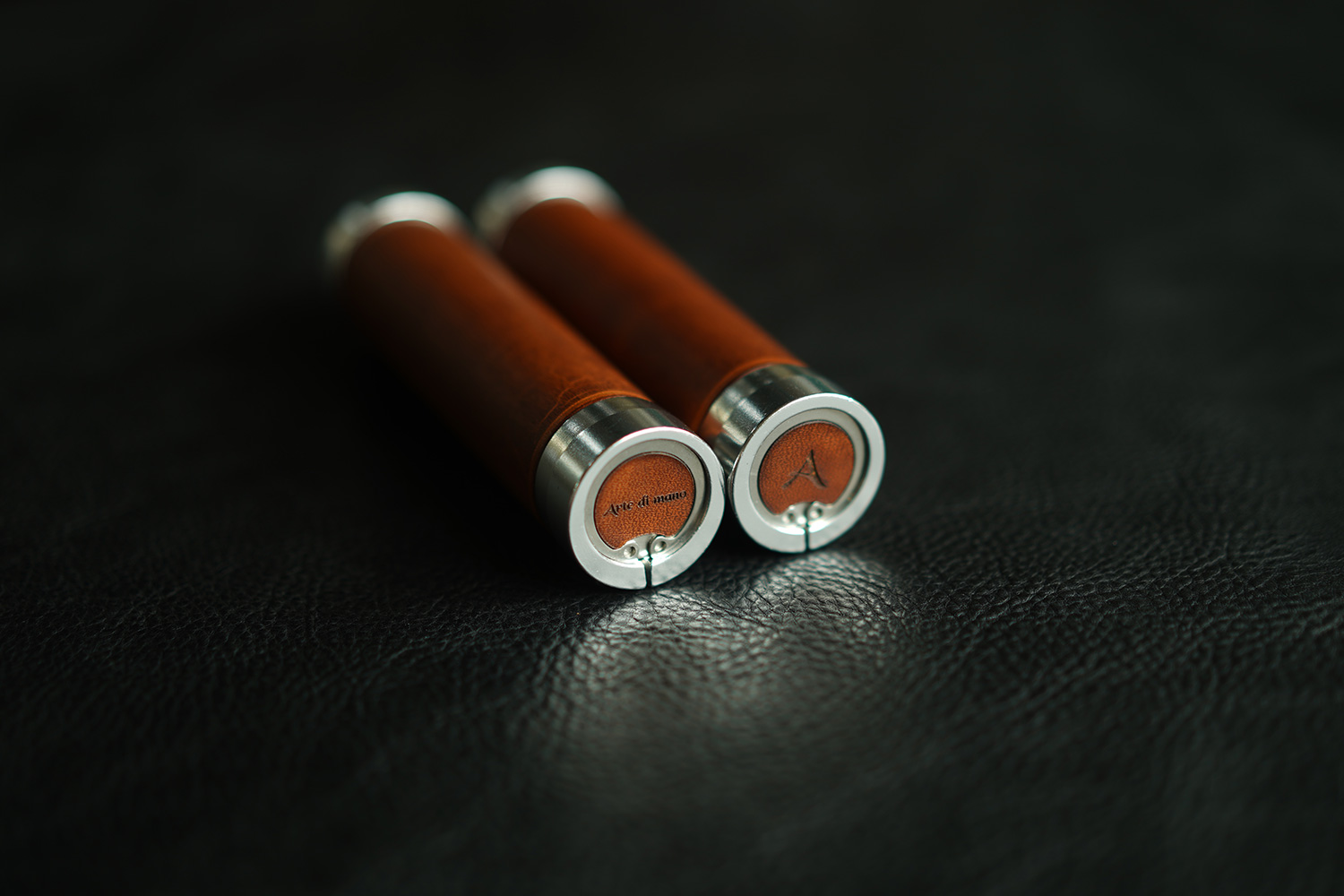 양쪽 엔드 캡 부분은 Arte di mano의 로고가 새겨진 가죽 태그로 채워집니다. 기본 구성에서 한쪽은 텍스트로고, 한쪽은 Arte di mano의 'A' 이니셜 로고를 레이져 각인하였습니다.