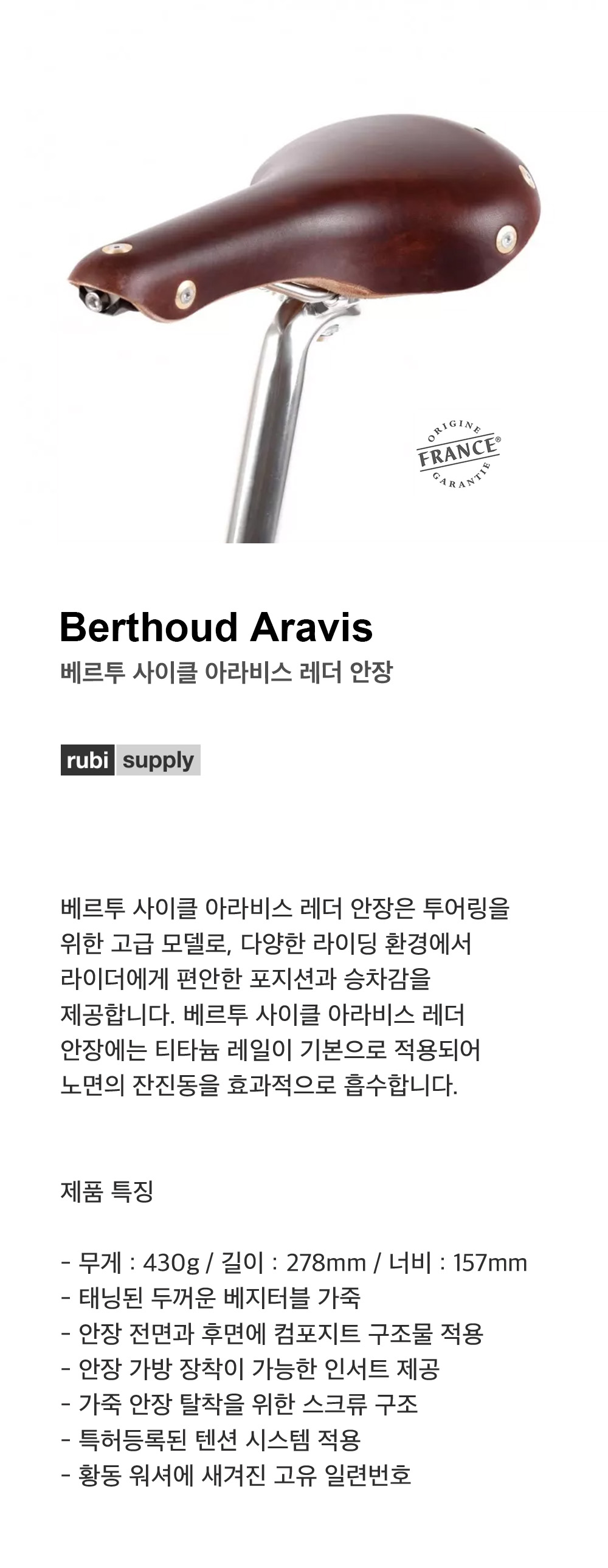 베르투 사이클 아라비스 레더 안장 내추럴
