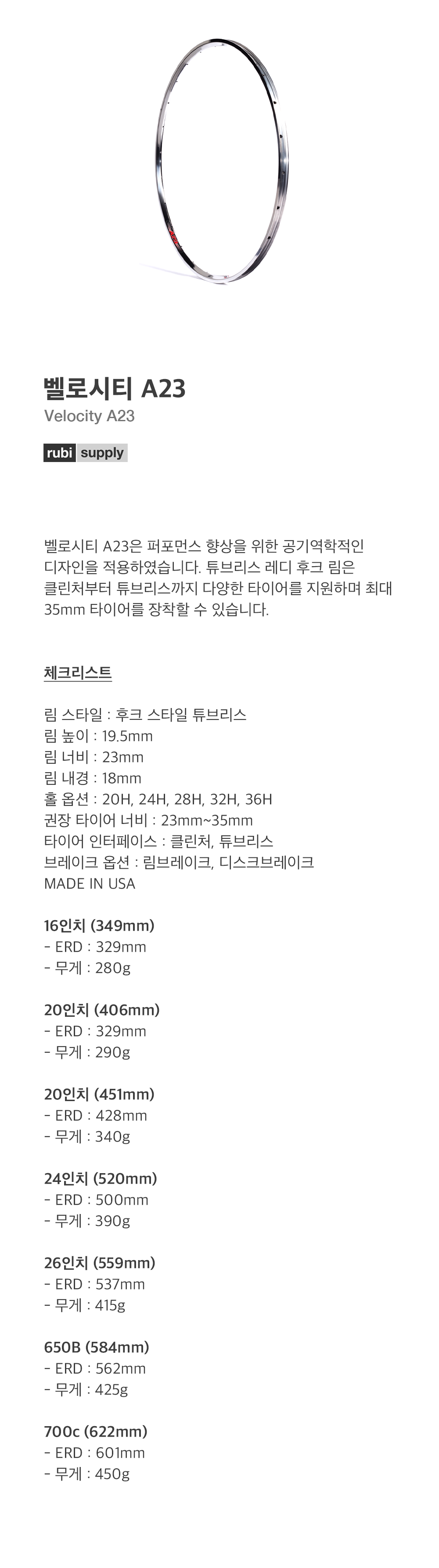 벨로시티 A23 20인치 451 사이즈 튜브리스 레디 림