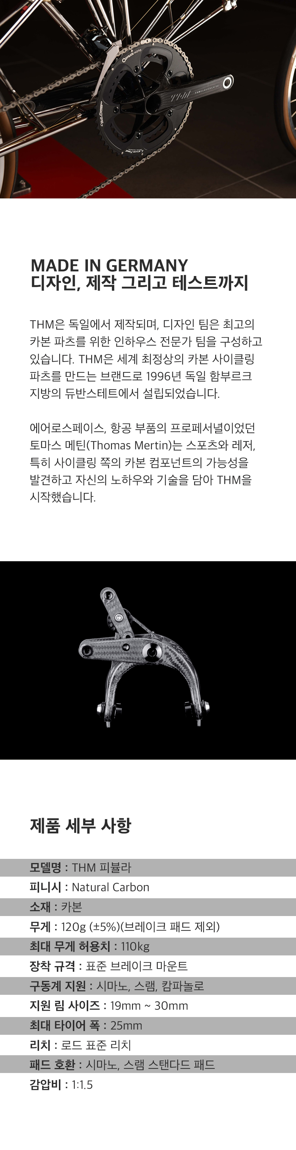 THM 피뷸라 로드 브레이크는 최근 주목받고 있는 와이드 림에 대응하기 위해 새롭게 개선되었습니다. 지난 10년동안 THM 피뷸라 브레이크는 ‘초경량’이라는 최초의 컨셉을 유지하면서 최고의 브레이크 성능을 구현하고 있습니다. 카본 파이버로만 구성된 바디와 브레이크암은 심미성과 기능성을 동시에 사로잡는 피뷸라 브레이크의 아이덴티티 입니다.