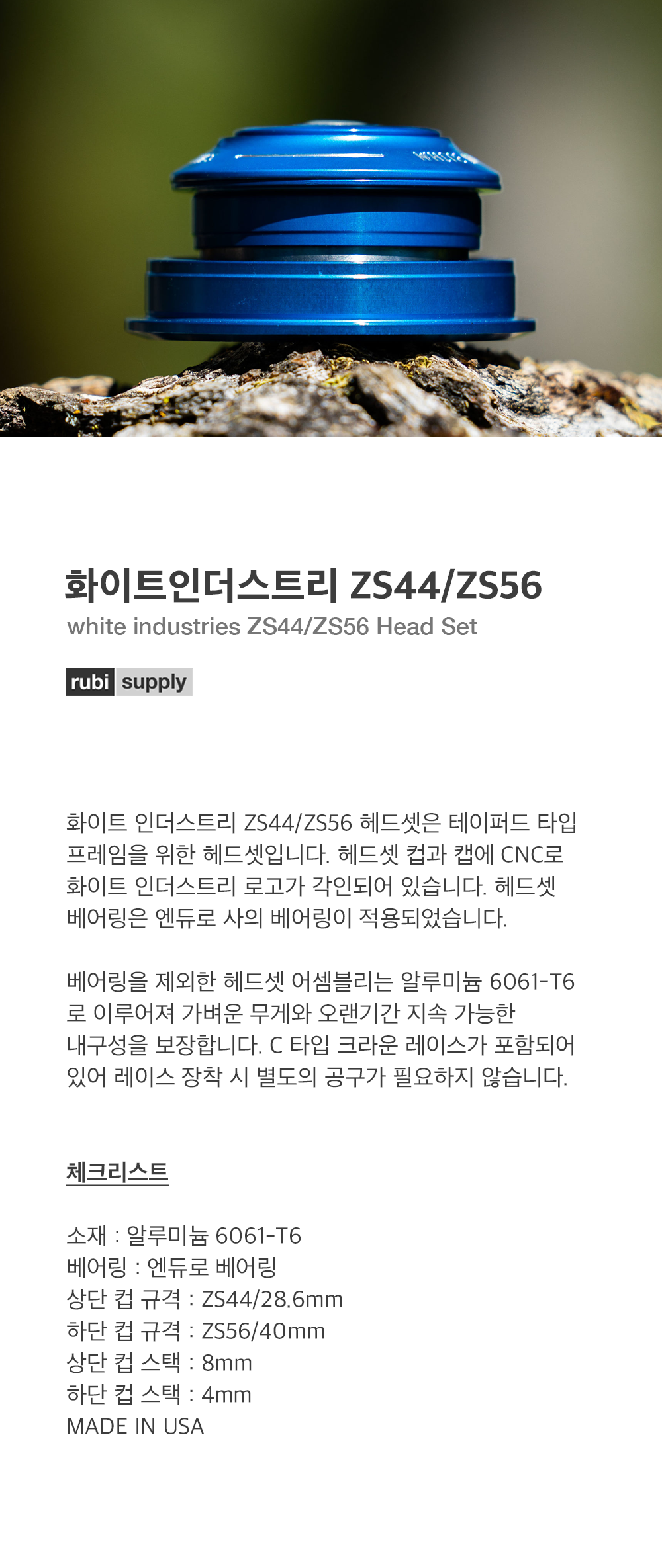 화이트 인더스트리 ZS44/ZS56 헤드셋은 표준 어헤드 타입 프레임을 위한 헤드셋입니다. 헤드셋 컵과 캡에 CNC로 화이트 인더스트리 로고가 각인되어 있습니다. 헤드셋 베어링은 엔듀로 사의 베어링이 적용되었습니다.