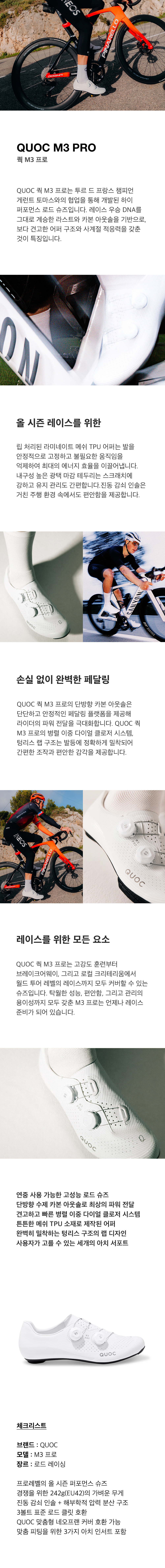 QUOC 쿽 M3 프로는 고강도 훈련부터 브레이크어웨이 상황, 로컬 크리테리움에서 월드 투어 레벨의 레이스까지 모두 커버할 수 있는 슈즈입니다. 탁월한 성능, 편안함, 그리고 관리의 용이성까지 모두 갖춘 M3 프로는 진정한 올 시즌 퍼포먼스 슈즈로, 언제나 깨끗하고, 언제나 레이스 준비가 되어 있습니다.