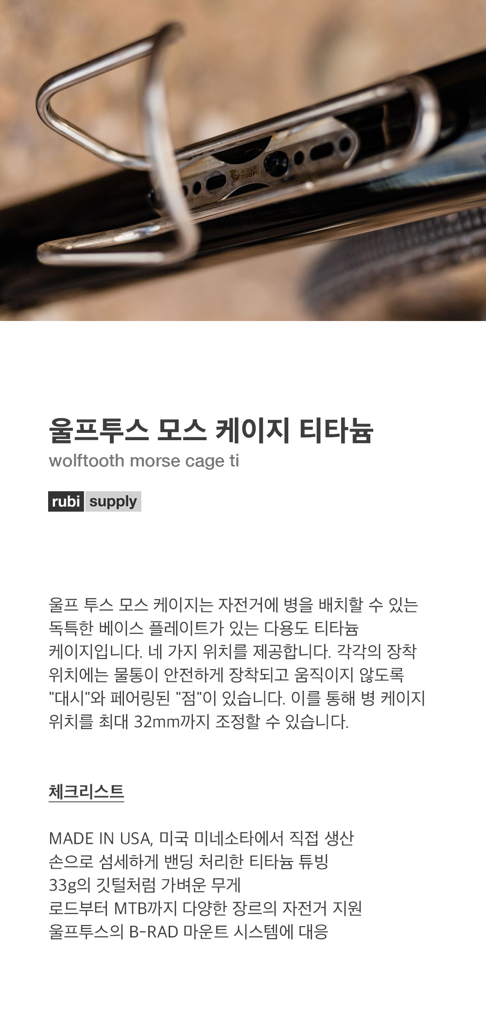 울프투스 모스 물통 케이지는 울프투스와 킹 케이지가 더 가볍고 장착하기 쉽게 만든 콜라보레이션의 결과입니다. '도트-대쉬'라고 불리는 마운팅 패턴은 모스 케이지가 32mm까지 수직 조정되는 네 개의 위치를 제공합니다.