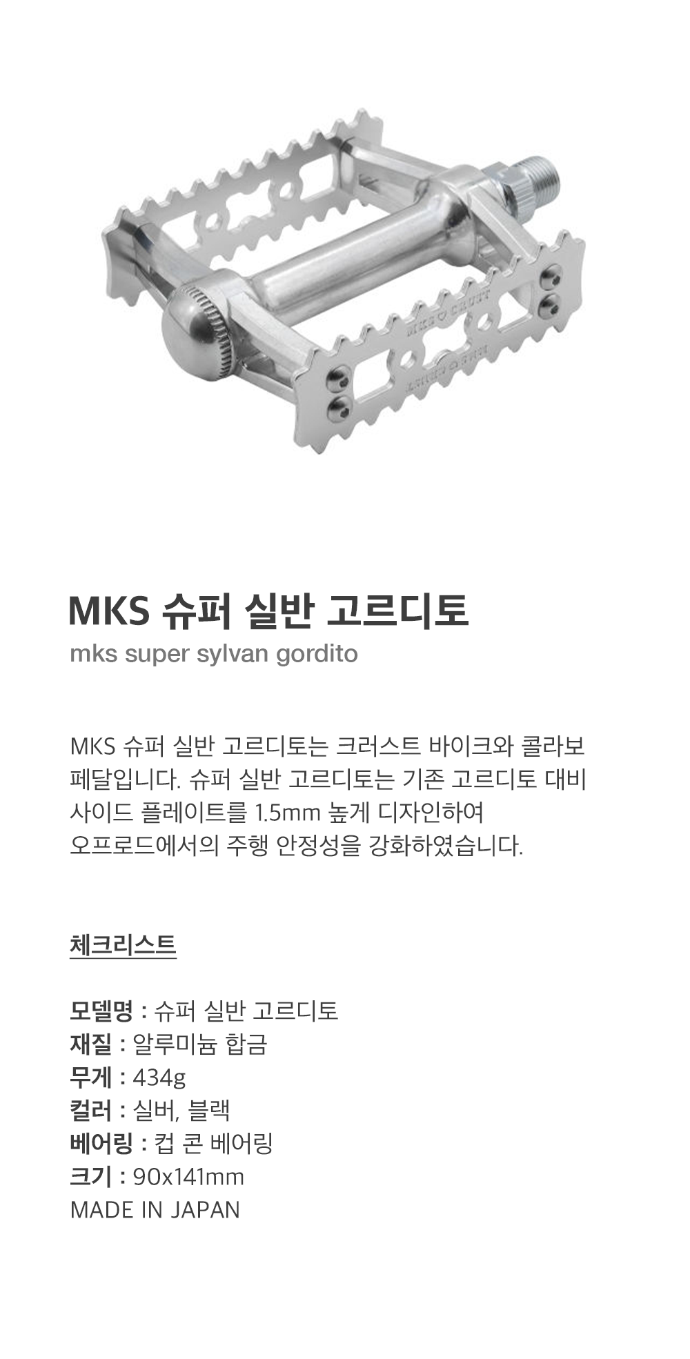 MKS 슈퍼 실반 고르디토는 크러스트 바이크와 콜라보 페달입니다. 슈퍼 실반 고르디토는 기존 고르디토 대비 사이드 플레이트를 1.5mm 높게 디자인하여 오프로드에서의 주행 안정성을 강화하였습니다.