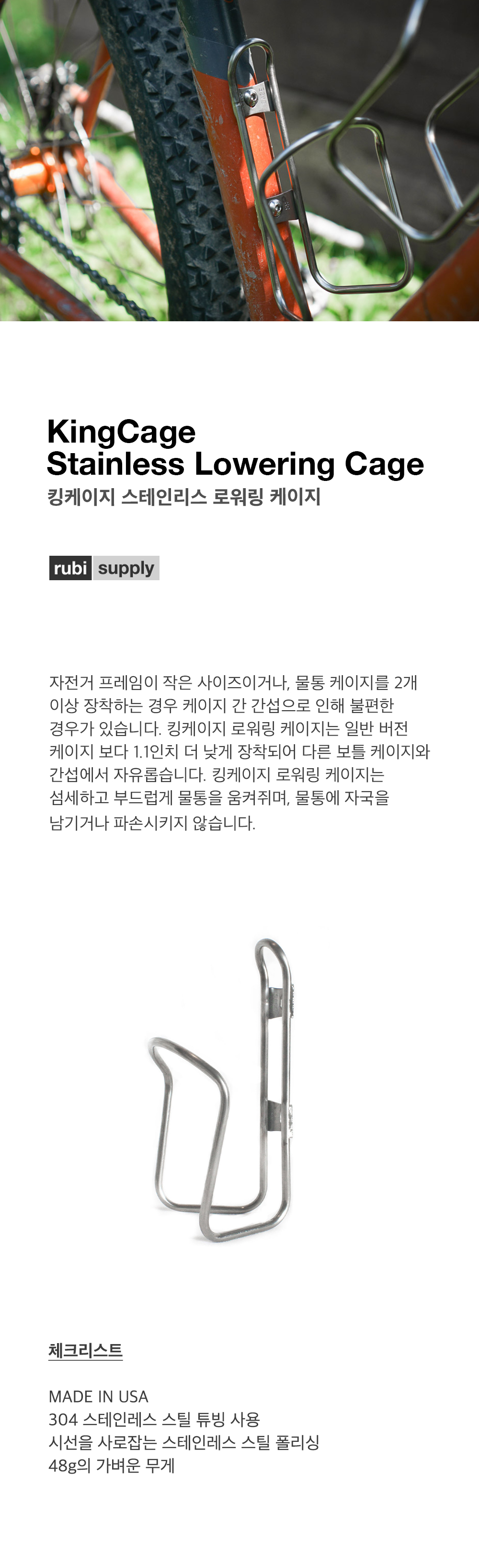 물통케이지를 2개 이상 장착하는 경우 케이지간 간섭으로 인해 불편한 경우가 많습니다. 보틀 다운 케이지는 1.1인치 더 낮게 장착 되어 다른 보틀 케이지와 간섭에서 자유롭습니다. 티타늄 버전과 스테인스 버전 사이에서 선택가능합니다.