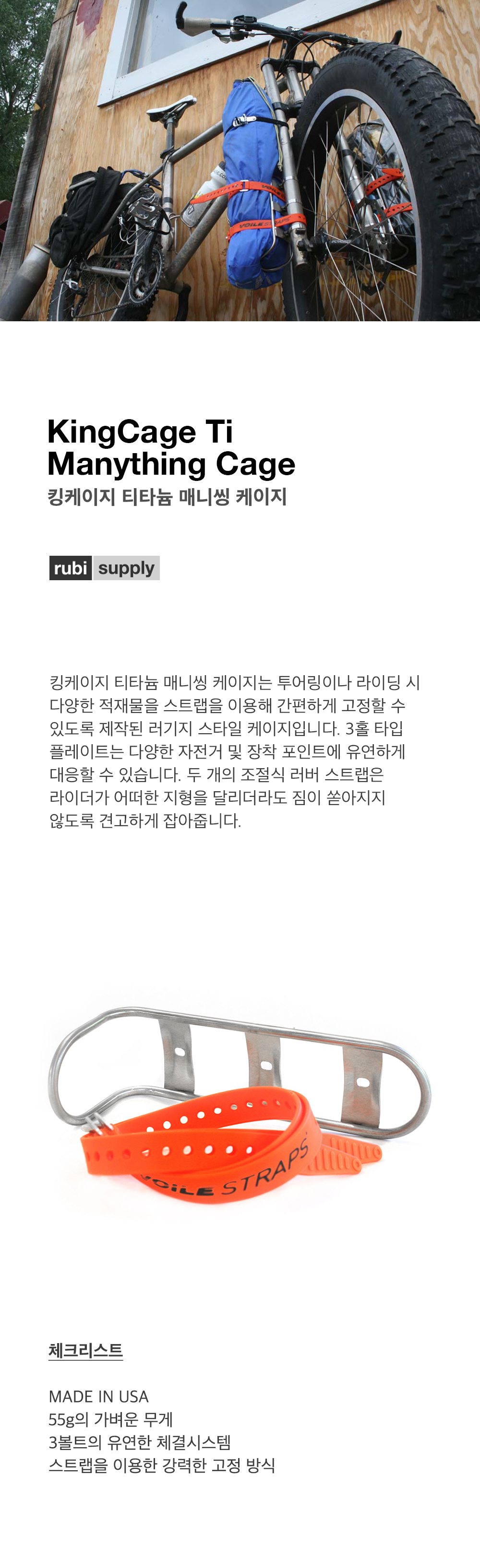 킹케이지 티타늄 매니씽 케이지는 투어링이나 라이딩 시 다양한 적재물을 스트랩을 이용해 간편하게 고정할 수 있도록 제작된 러기지 스타일 케이지입니다. 3홀 타입 플레이트는 다양한 자전거 및 장착 포인트에 유연하게 대응할 수 있습니다. 두 개의 조절식 러버 스트랩은 라이더가 어떠한 지형을 달리더라도 짐이 쏟아지지 않도록 견고하게 잡아줍니다.
