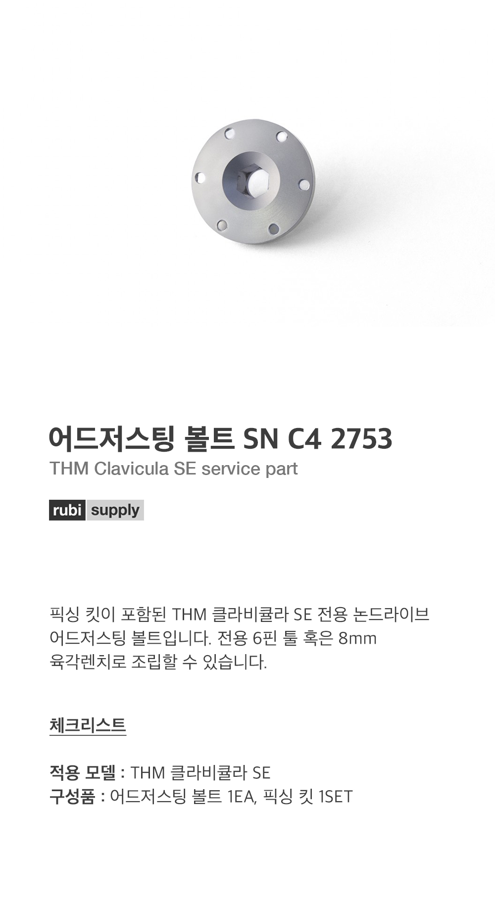 픽싱 킷이 포함된 THM 클라비큘라 SE 전용 논드라이브 어드저스팅 볼트입니다. 전용 6핀 툴 혹은 8mm 육각렌치로 조립할 수 있습니다.