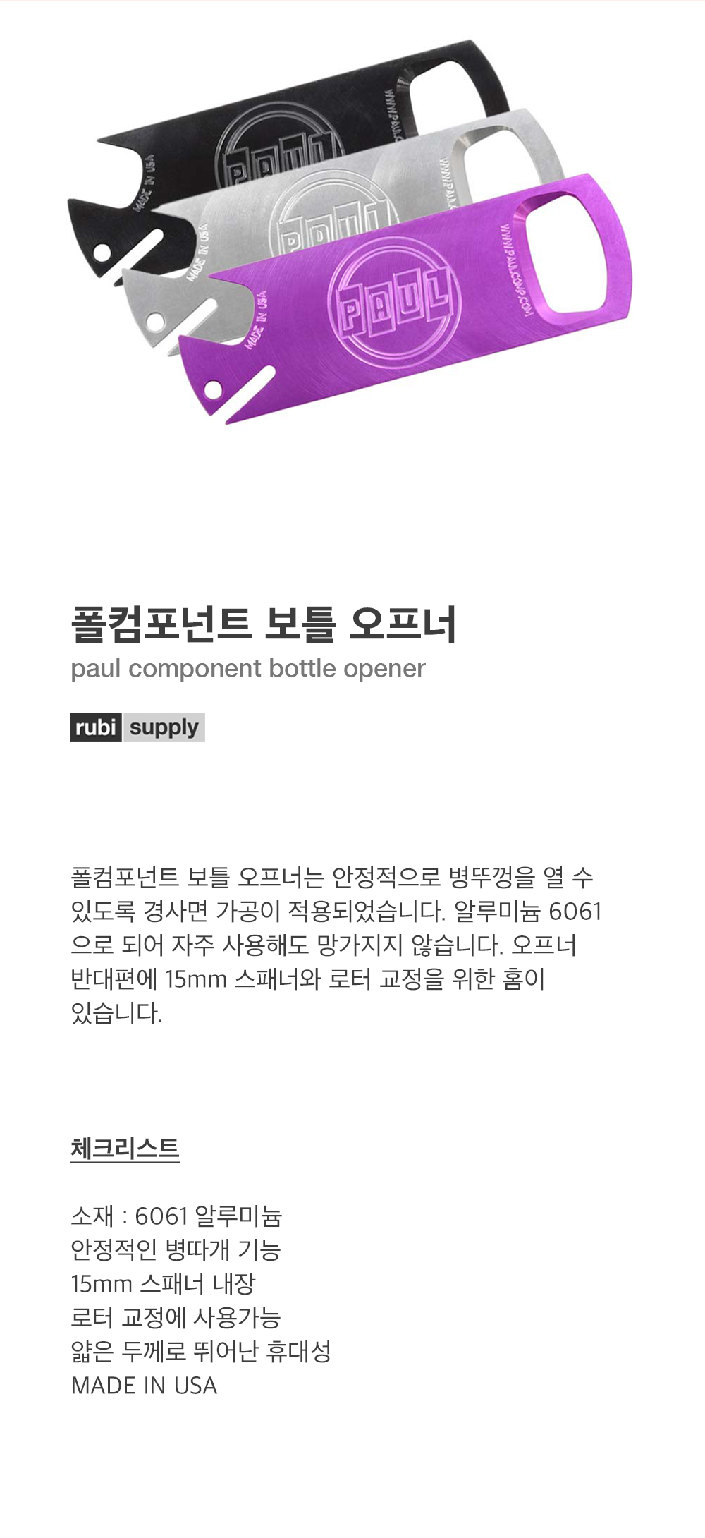 폴 컴포넌트 보틀 오프너는 안정적으로 병뚜껑을 열 수 있도록 경사면 가공이 적용되었습니다. 알루미늄 6061으로 되어 자주 사용해도 망가지지 않습니다.